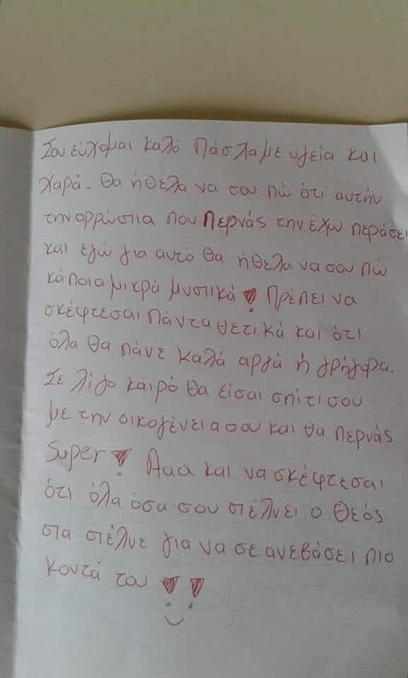 Σαν σήμερα ο γιος μου Κωνσταντίνος Εφραίμ πήρε ένα μήνυμα αισιοδοξίας απο μια άλλη μαχήτρια.