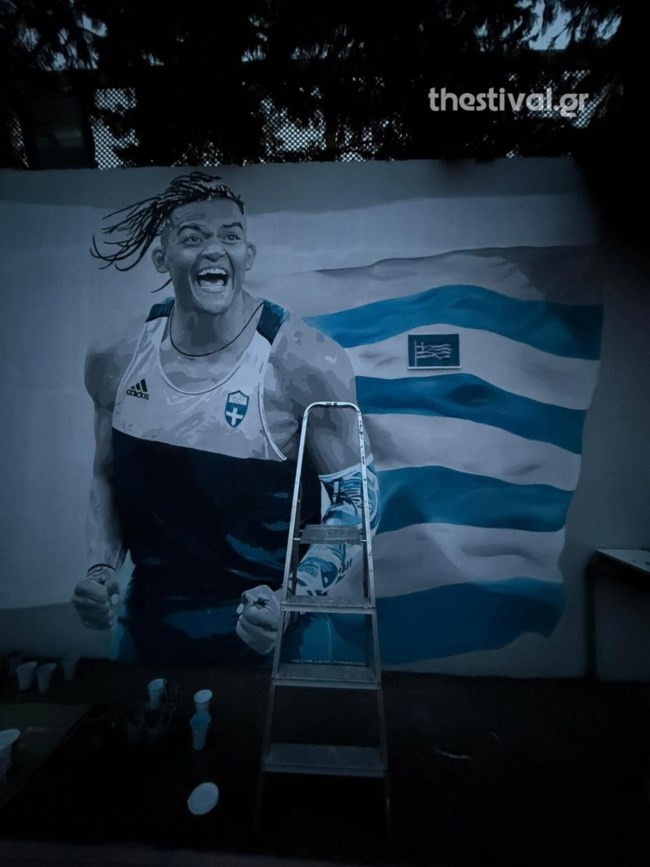 Η τοιχογραφία, γεμάτη ζωντανά χρώματα και δυναμισμό, απεικονίζει τον Καραλή σε μια εμβληματική στιγμή του αγώνα, αποδίδοντας την ένταση, την προσπάθεια και τη θέληση που τον διακρίνουν. Για τον δημιουργό του έργου, η επιλογή του συγκεκριμένου αθλητή δεν ήταν τυχαία.