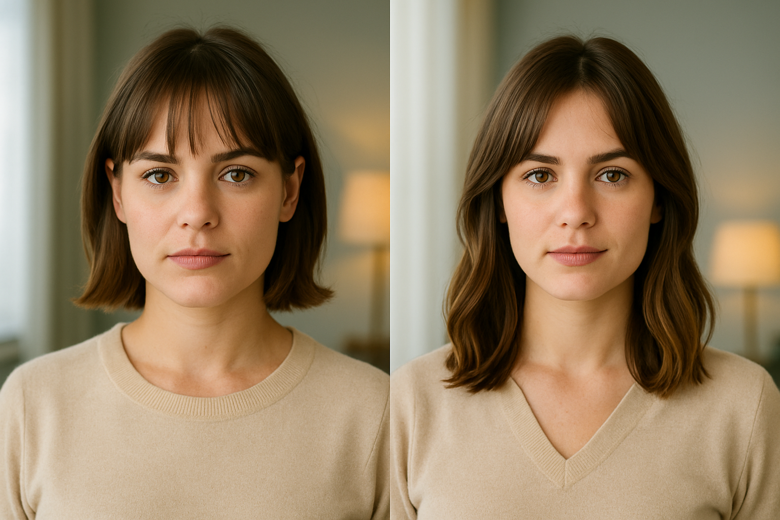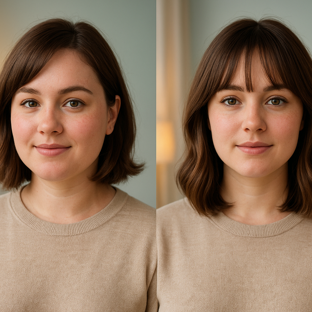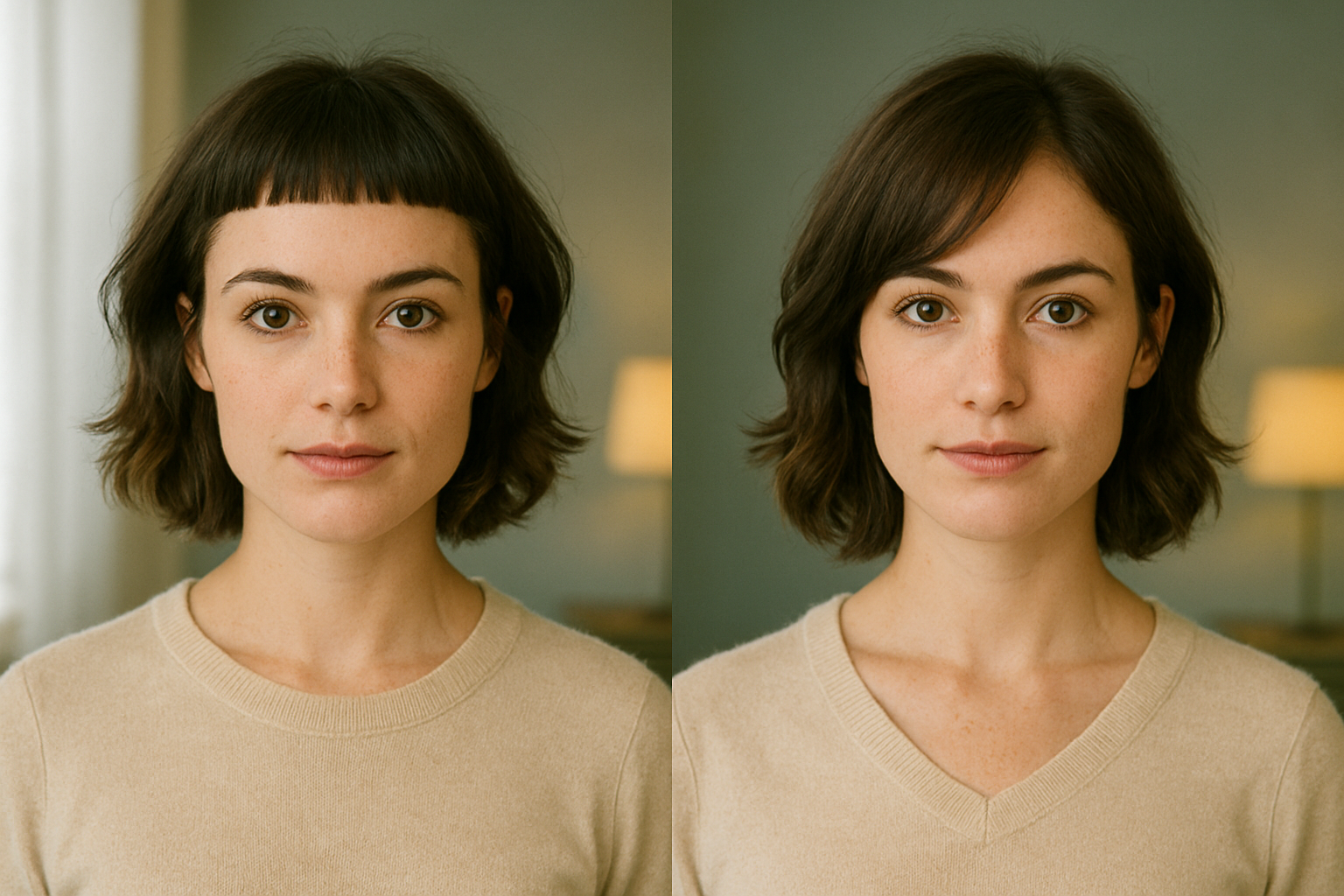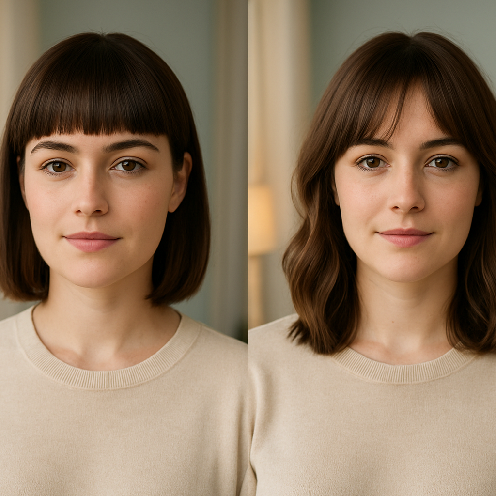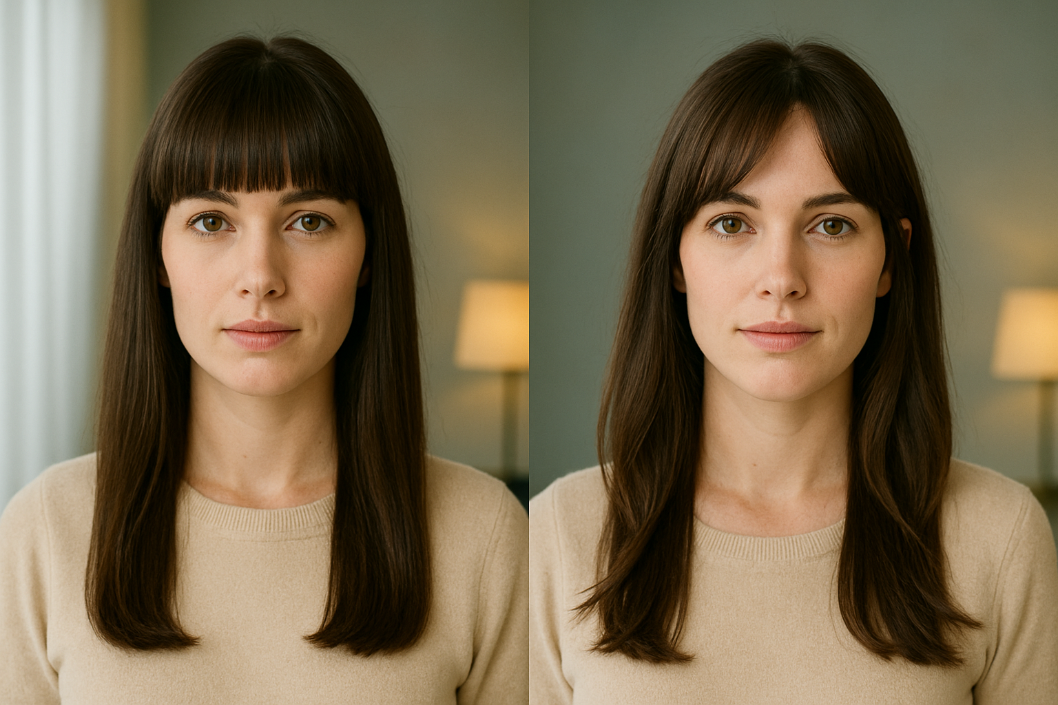 Curtain bangs που πλαισιώνουν το πρόσωπο και μειώνουν την ένταση των γωνιών.