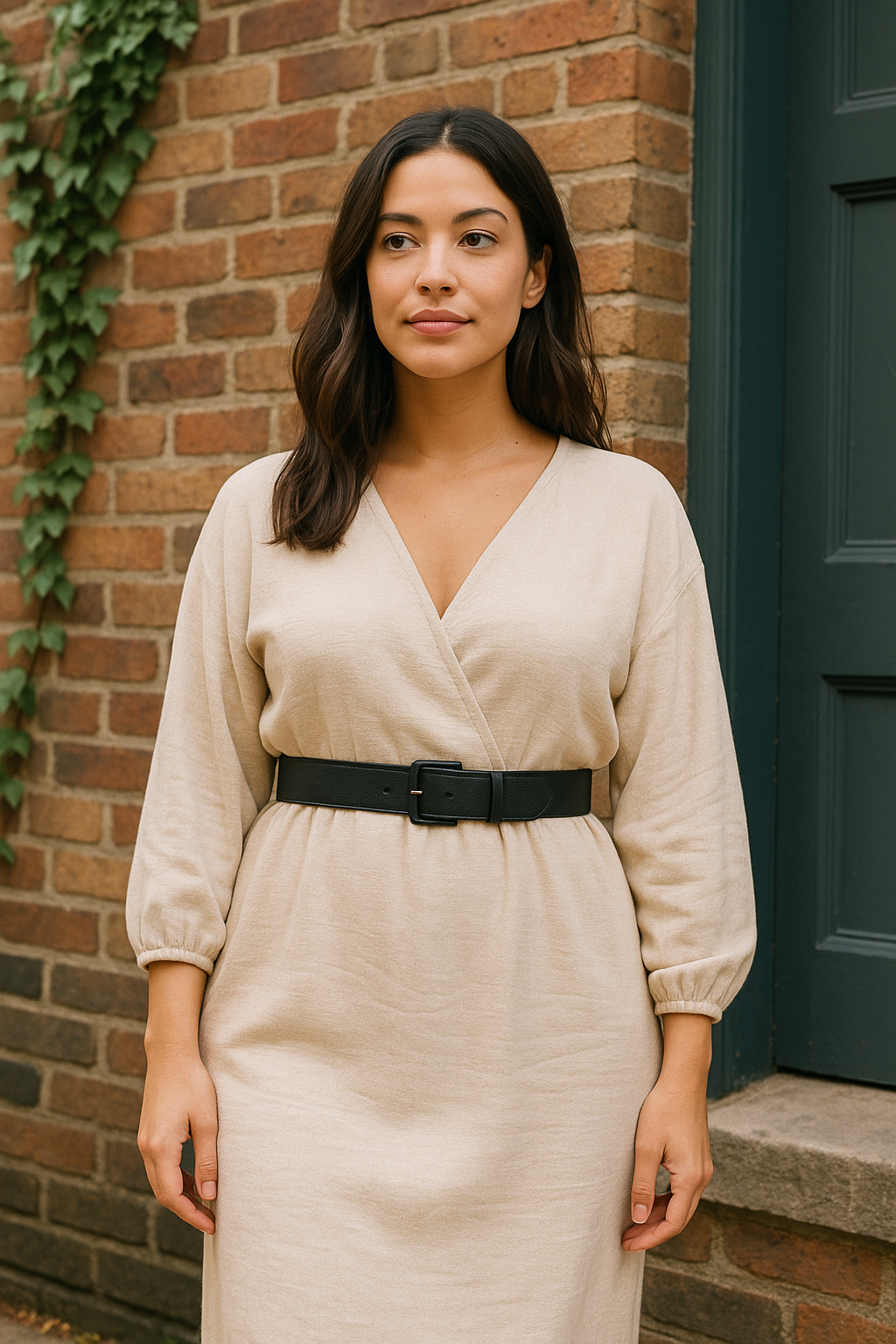 Ένα έξυπνο trick είναι να φορέσεις τη ζώνη 2-3 εκατοστά πάνω από τη φυσική σου μέση. Αυτό τραβάει το βλέμμα προς τα πάνω και δίνει την αίσθηση μακρύτερων ποδιών και μικρότερης κοιλιάς. Ειδικά σε φορέματα Α-γραμμής είναι σωτήριο!