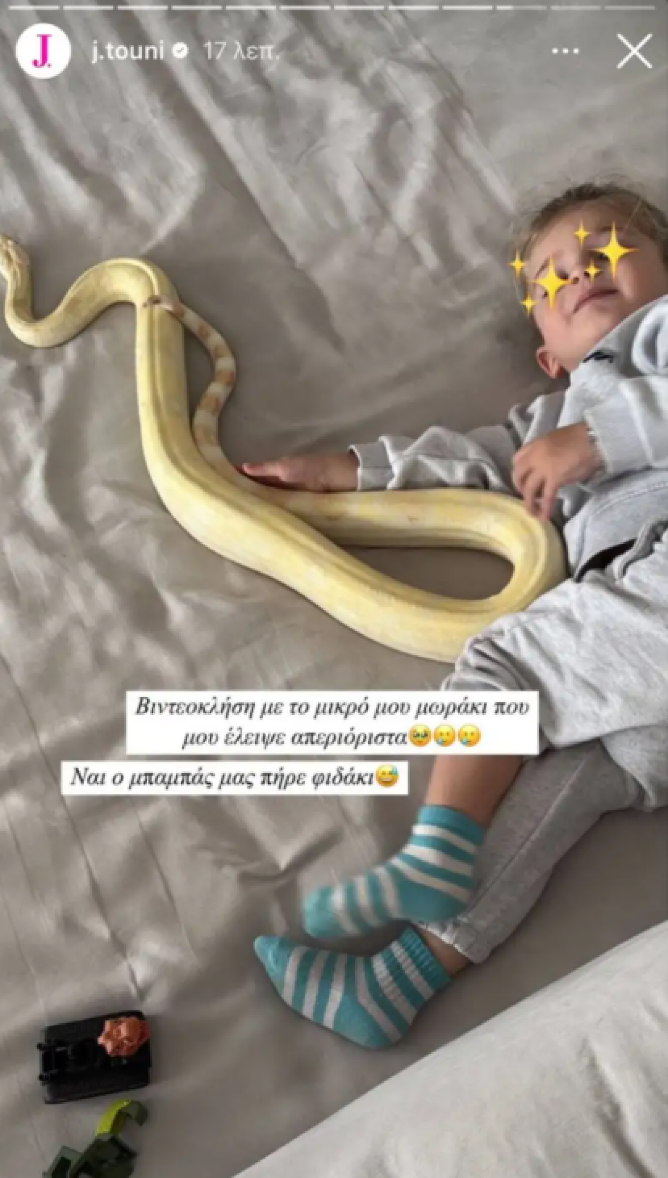 Σε στιγμιότυπο που δημοσίευσε η ίδια στον προσωπικό της λογαριασμό στο Instagram, ο γιος της φαίνεται ξαπλωμένος στο κρεβάτι δίπλα σε ένα τεράστιο φίδι. Πάνω στη φωτογραφία έγραψε: «Βιντεοκλήση με το μικρό μου μωράκι που μου έλειψε απεριόριστα. Ναι ο μπαμπάς μας πήρε φιδάκι».