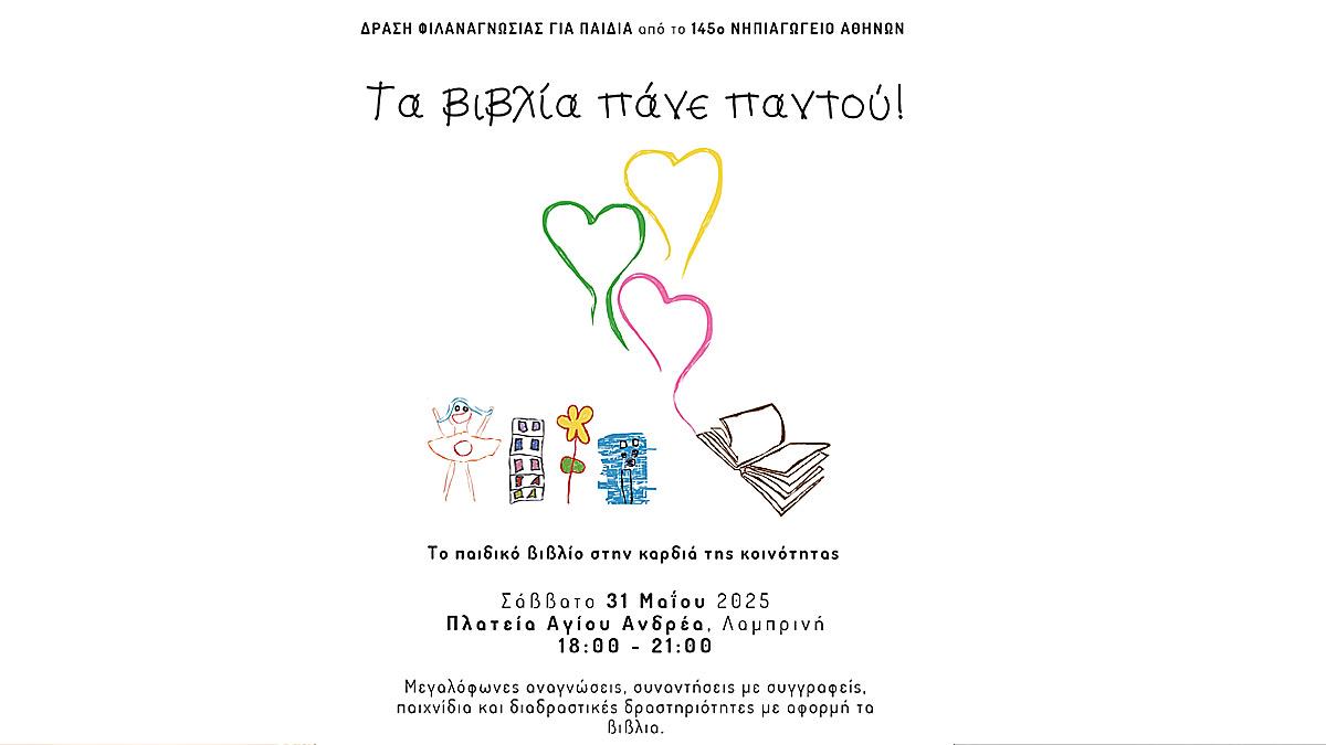 Η δράση φιλαναγνωσίας «Τα βιβλία πάνε παντού» που θα υλοποιηθεί από το νηπιαγωγείο μας το Σάββατο 31 Μαΐου 2025 στην πλατεία Αγίου Ανδρέα στη Λαμπρινή, υπό την αιγίδα του Κύκλου του Ελληνικού Παιδικού Βιβλίου, εντάσσεται σε μια γενικότερη προσπάθεια που καταβάλουμε φέτος για να δημιουργήσουμε ένα υποστηρικτικό περιβάλλον για την καλλιέργεια της φιλαναγνωσίας, όχι μόνο στο σχολείο αλλά και στο σπίτι και στην ευρύτερη κοινότητα. Αφορμή για αυτό στάθηκε η διαπίστωση ότι η συνεργασία ανάμεσα στο σχολείο, την οικογένεια αλλά και την κοινότητα στις δράσεις φιλαναγνωσίας κρίνεται σημαντικός παράγοντας για τη θετική κινητοποίηση των παιδιών απέναντι στο βιβλίο, αφού συνδέει όλους όσοι διαμορφώνουν το πλαίσιο για την ολόπλευρη ανάπτυξή του.