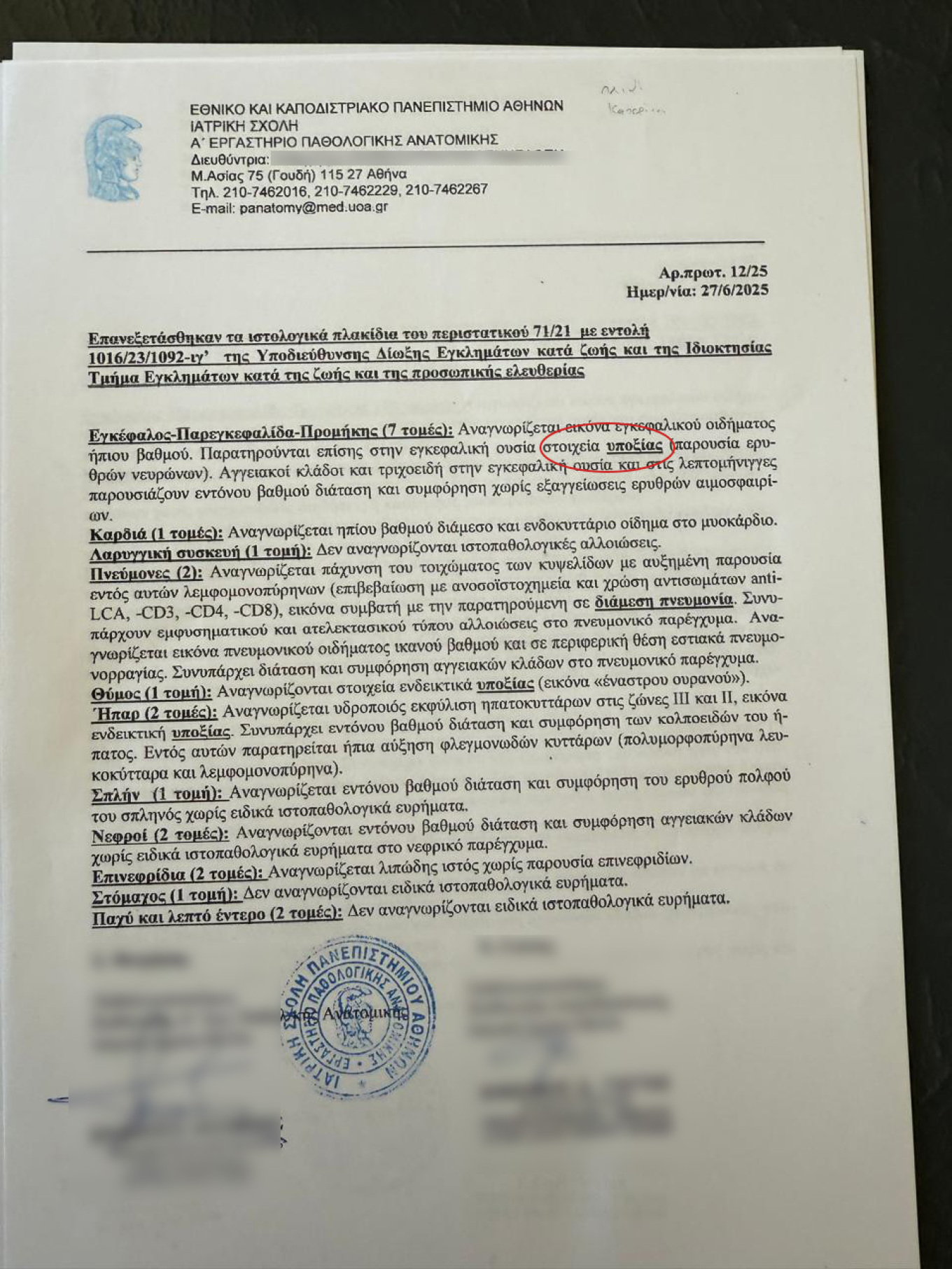 Οι πραγματογνωμοσύνες των παθολογοανατόμων της ΕΛ.ΑΣ. σε συνδυασμό με τους άλλους δυο επιστήμονες της 4μελους επιτροπής που είχε συσταθεί έδωσαν το πρώτο καμπανάκι: υποξία. Ξαφνική αποστέρηση οξυγόνου. Χωρίς παθολογικά αίτια. Χωρίς προειδοποίηση. Ένα μοτίβο που επαναλαμβανόταν.