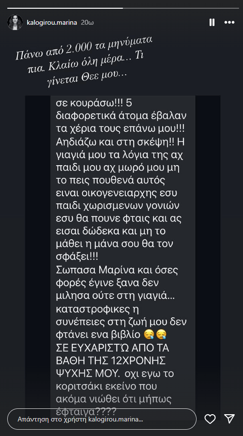 «Πάνω από 2.000 τα μηνύματα πια. Κλαίω όλη μέρα. Τι γίνεται Θεέ μου;» έγραψε χαρακτηριστικά στην ανάρτησή της η Μαρίνα Καλογήρου.