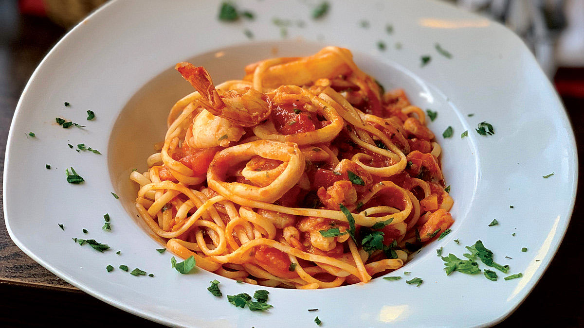 Προσθέτουμε τα θαλασσινά, 2-3 κ.σ. ελαιόλαδο, τον υπόλοιπο βασιλικό, ανακατεύουμε και αφαιρούμε από τη φωτιά