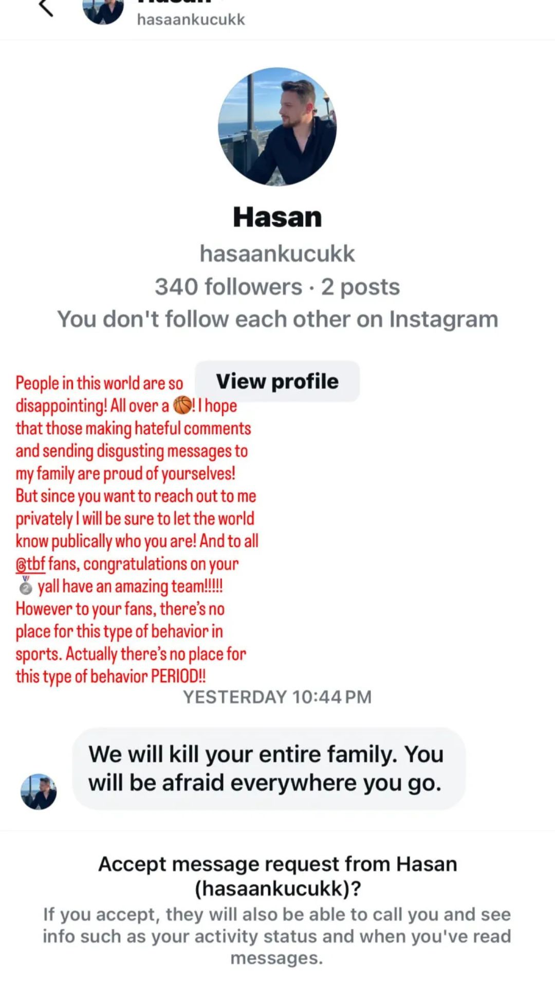 «Οι άνθρωποι σε αυτόν τον κόσμο με απογοητεύουν τόσο πολύ. Και όλα αυτά για μια μπάλα μπάσκετ. Ελπίζω αυτοί που έκαναν αυτά τα σχόλια με μίσος και έστειλαν αυτά τα αηδιαστικά μηνύματα στην οικογένειά μου να είναι υπερήφανοι! Αλλά αφού θέλετε να τα στείλετε ιδιωτικά, θα διασφαλίσω ότι θα μάθουν όλοι δημόσια ποιοι είστε. Στην τουρκική ομοσπονδία μπάσκετ, συγχαρητήρια για το ασημένιο μετάλλιο, έχετε σπουδαία ομάδα. Ωστόσο για τους φιλάθλους σας, δεν υπάρχει χώρος για τέτοιες συμπεριφορές στον αθλητισμό. Βασικά δεν υπάρχει κανένας χώρος για αυτή τη συμπεριφορά. Τελεία και παύλα».