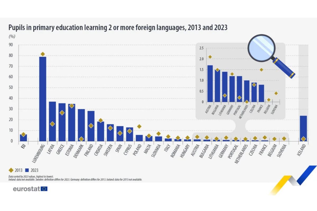 Το 2023, μόλις το 6,4% των μαθητών δημοτικού σχολείου στην ΕΕ μάθαιναν 2 ή περισσότερες ξένες γλώσσες. Μεταξύ 2013 και 2023, αυτό το ποσοστό αυξήθηκε κατά 1,8 ποσοστιαίες μονάδες (από το 4,6%).
