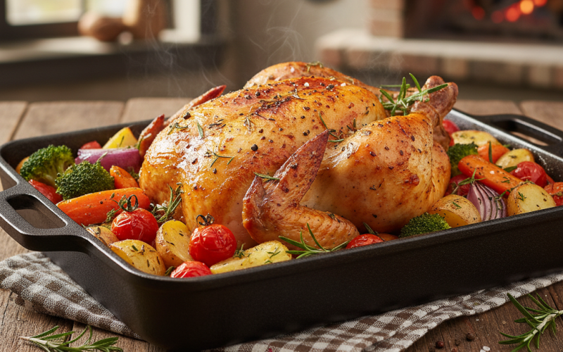 Ψήνουμε για περίπου 1 ώρα και 15 λεπτά. Στη μέση του χρόνου, ανακατεύουμε ελαφρά τα λαχανικά και γυρίζουμε τα κομμάτια του κοτόπουλου, ώστε να ροδίσουν ομοιόμορφα. Αν χρειαστεί, προσθέτουμε λίγο νερό ή ζωμό για να μην στεγνώσει το φαγητό.