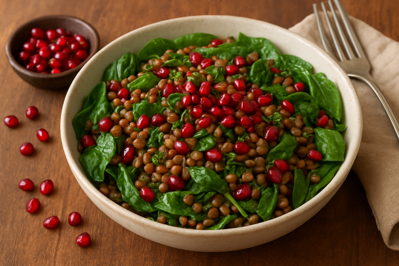 Ζεστή σαλάτα με φακές, ρόδι και σπανάκι