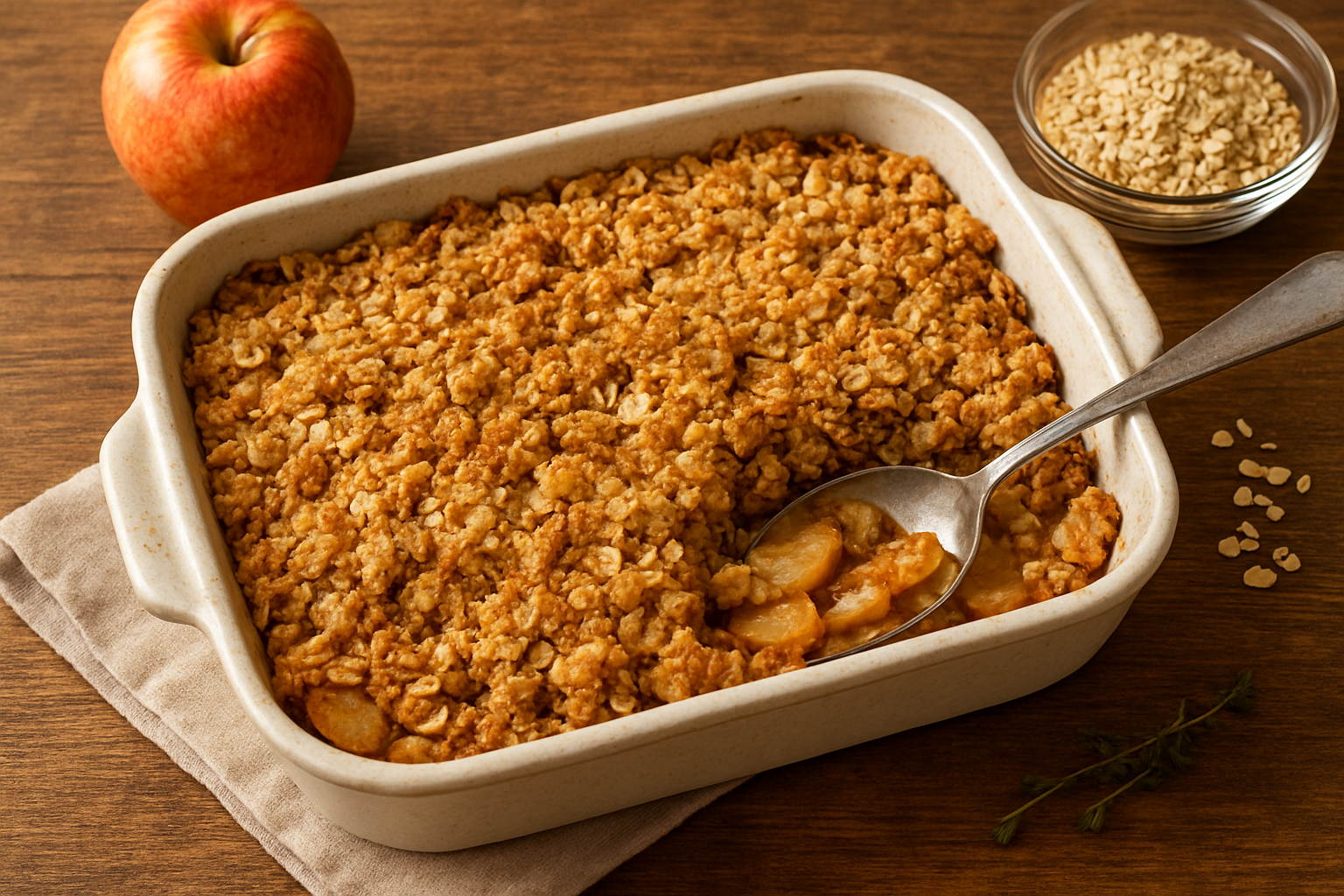 - Στρώνουμε τα μήλα σε ταψάκι και από πάνω ρίχνουμε το μείγμα βρώμης
