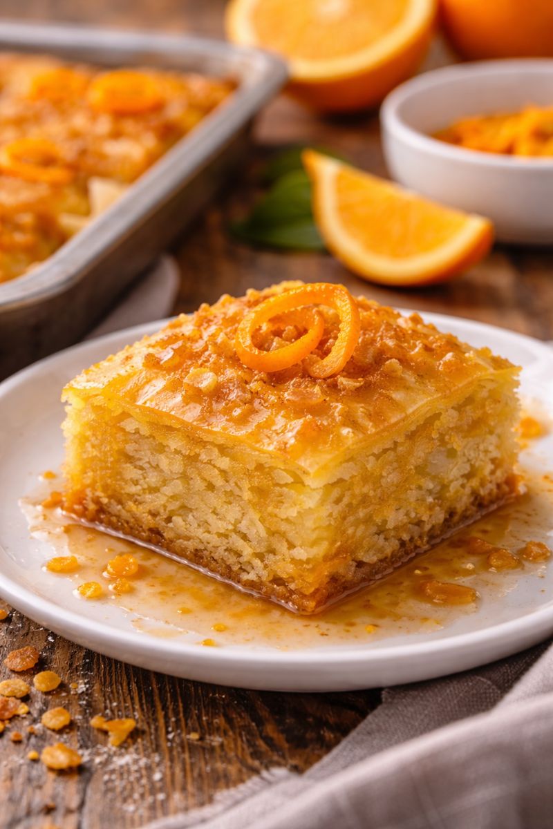 Ανοίγουμε τα 5 φύλλα κρούστας για γλυκά, σε ένα μεγάλο ταψί και τα βάζουμε στον φούρνο, στον αέρα, στους 100°-120° C για περίπου 1 ώρα. Ανά τέταρτο γυρίζουμε τα φύλλα. Σκοπός δεν είναι να ψηθούν, αλλά να ξεραθούν πολύ καλά. Αφού ξεραθούν, τα αφήνουμε εκτός φούρνου να κρυώσουν. Τα σπάμε με τα χέρια και τα θρυμματίζουμε σε πολύ-πολύ μικρά κομμάτια. Αυτή η διαδικασία μπορεί να γίνει και από την προηγούμενη μέρα. Βάζουμε στον κάδο του μίξερ τα αυγά, τη ζάχαρη, το λάδι και τη βανιλίνη. Χτυπάμε το μείγμα των αυγών σε υψηλή ταχύτητα με το σύρμα, για 10 λεπτά, μέχρι να αφρατέψει. Εν τω μεταξύ, ανακατεύουμε χωριστά το μπέικιν πάουντερ με το γιαούρτι και αφήνουμε στην άκρη για 2 - 3 λεπτά. Σταματάμε το μίξερ, ρίχνουμε μέσα στον κάδο το γιαούρτι και ανακατεύουμε αργά και απαλά μέχρι να ενσωματωθούν όλα τα υλικά. Προσθέτουμε το ξύσμα πορτοκαλιού και λίγα-λίγα τα θρυμματισμένα ξερά φύλλα. Λαδώνουμε ένα μέτριο ταψί ή οβάλ πυρέξ και απλώνουμε μέσα το μείγμα.