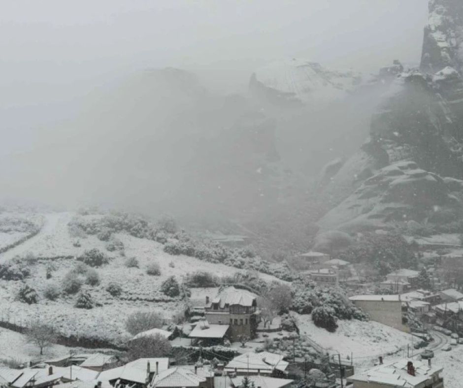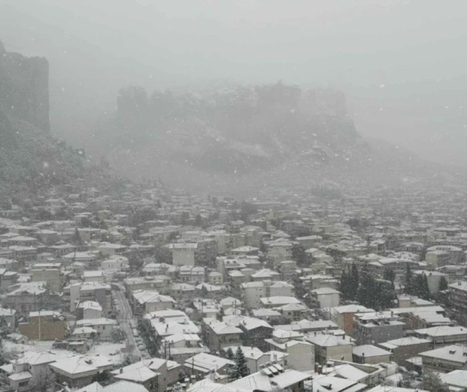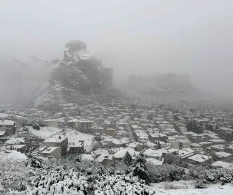 Εντυπωσιακές είναι οι εικόνες και από τη χιονισμένη Καλαμπάκα, στη σκιά των Μετεώρων