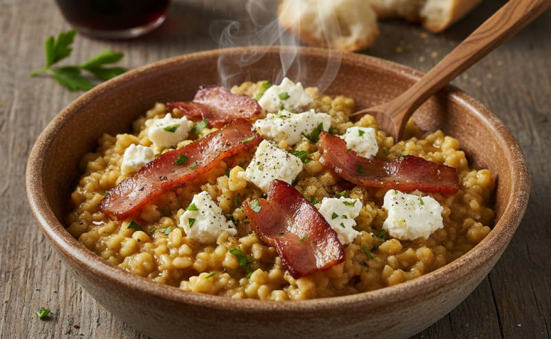 Ρίχνουμε φρεσκοτριμμένο πιπέρι και, αν θέλουμε, ένα μικρό κομματάκι βούτυρο για πιο πλούσια γεύση. Δοκιμάζουμε πριν προσθέσουμε αλάτι, γιατί η φέτα και το μπέικον συνήθως αρκούν.
