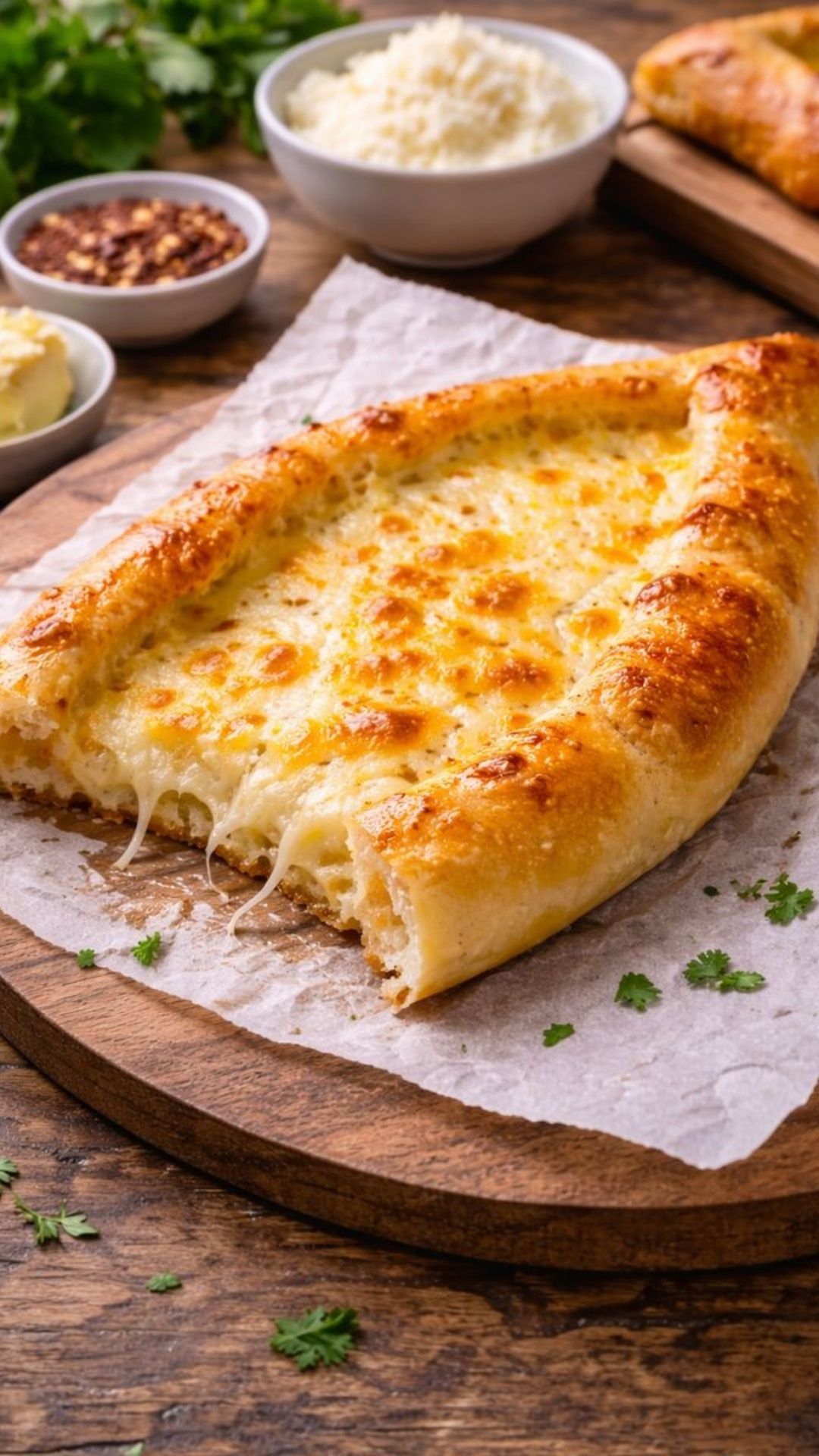 Τσιμπάμε δύο άκρες του δίσκου, τη μία απέναντι από την άλλη, ώστε να σχηματίσουμε μια φαρδιά βαρκούλα. Στο κέντρο κάθε βαρκούλας βάζουμε λίγη φέτα και σκεπάζουμε με ένα κομμάτι κασέρι.