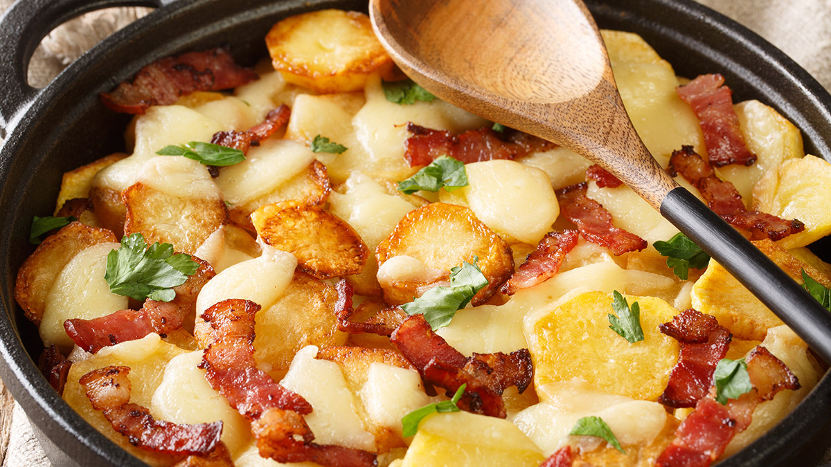 - Σε ένα πυρίμαχο σκεύος στρώνουμε πατάτες, λίγο μπέικον, τυρί και συνεχίζουμε σε στρώσεις.