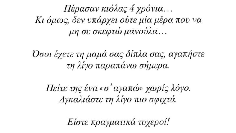 «Πέρασαν κιόλας 4 χρόνια... Κι όμως δεν υπάρχει ούτε μια μέρα που να μη σε σκεφτώ μανούλα...» γράφει η Ιωάννα Τούνη.