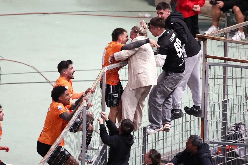 Μόλις σκόραρε, έτρεξε να πανηγυρίσει με τους οπαδούς της ομάδας που ταξίδεψαν από την Κρήτη αλλά... έπεσε στην αγκαλιά της μητέρας του! Mαμά και γιος σκαρφάλωσαν τα κάγκελα του Πανθεσσαλικού και πανηγύρισαν το γκολ αγκαλιασμένοι με δάκρυα στα μάτια.