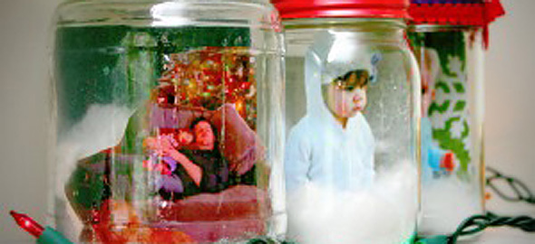 Ρίξτε μπόλικο «χιόνι» (λευκά πομπομ) στον πάτο του βάζου, πίσω και γύρω από την φωτογραφία. Αντί για λευκά πομπομ μπορείτε να βάλετε λίγη κόλλα στον πάτο του βάζου και να ρίξετε γκλίτερ που θα κολλήσει.