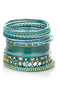 Σετ από μεταλλιζέ βραχιόλια, με χάντρες και καθρεφτάκια, σε σμαραγδί και τιρκουάζ χρώματα.
