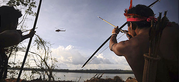 «Η υδροηλεκτρική δεξαμενή Belo Monte, η οποία πρόκειται να είναι η τρίτη μεγαλύτερη του κόσμου, είναι μία από περισσότερες από 60 δεξαμενές που η κυβέρνηση της Βραζιλίας σκοπεύει να φτιάξει στη λεκάνη του Αμαζονίου. Οι αυτόχθονες κάτοικοι, όμως, που ζουν εκεί αντιδρούν για τις επιπτώσεις που η κατασκευή αυτή μπορεί να έχει στο περιβάλλον. Στη φωτογραφία, η φυλή Munduruku στοχεύει με τα βέλη της σε διερχόμενο ελικόπτερο της κατασκευαστικής εταιρίας.»