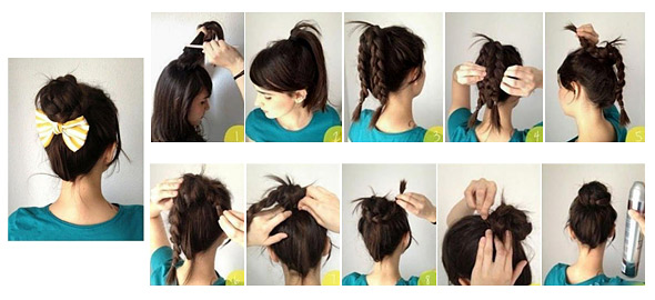 Πιάνετε τα μαλλιά σας μία ψηλή αλογοουρά με λαστιχάκι. Ξεχωρίζετε από αυτήν μία μακριά τούφα. Περιστρέφετε τα υπόλοιπα μαλλιά της αλογοουράς γύρω από τον εαυτό τους για να γίνει κότσος, τον οποίον στερεώνετε με τσιμπιδάκια. Πλέκετε σε πλεξούδα την τούφα που αφήσατε έξω και τυλίγετε την πλεξούδα στη βάση του κότσου. Αν θέλετε στολίζετε τα μαλλιά σας με ένα λουλούδι ή ένα κοκαλάκι-φιογκάκι.