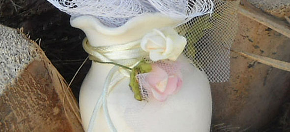 Μπομπονιέρα για γάμο ή βάπτιση, την οποία μπορείτε να φτιάξετε αγοράζοντας μικρά κεραμικά βαζάκια, γεμίζοντάς τα με δίχτυ και δένοντας γύρω τους όμορφες κορδέλες.