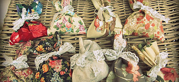 Θα χρειαστείτε κομμάτια από vintage ύφασμα σε διάφορα χρώματα, τα οποία θα ράψετε έτσι ώστε να σχηματίζουν πουγκιά και θα τα δέσετε με δαντελένιες κορδέλες. Θα σας βοηθήσει περισσότερο αν έχετε ραπτομηχανή.