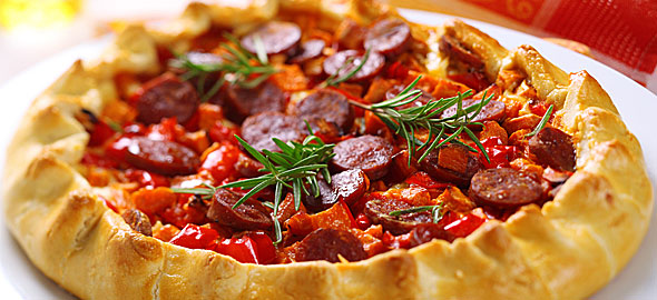 Τάρτα με καραμελωμένα κρεμμύδια και χωριάτικο λουκάνικο