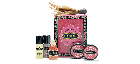 Προτείνουμε το Strawberry Weekender Kit της γνωστής αμερικάνικης φίρμας αισθησιακών καλλυντικών KamaSutra, με όλα τα απαραίτητα αισθησιακά καλλυντικά για το ζευγάρι που σκοπεύει να περάσει ένα ... αξέχαστο Σαββατοκύριακο. Στο kit θα βρείτε Strawberry Oil of Love (λάδι βρώσιμο με γεύση φράουλας για πικάντικα φιλιά σε όλο το κορμί), Love Liquid (λιπαντικό νερού για έξτρα ολίσθηση), Sweet Almond Massage Oil (λάδι για μασάζ με άρωμα αμυγδάλου ), Strawberry Pleasure Balm (βρώσιμο διεγερτικό τζελ για τα επίμαχα σημεία αντρών και γυναικών με γεύση φράουλας) και Strawberry Honeydust (βρώσιμη πούδρα που απλώνεται σε σώμα ή σεντόνια με βάση το μέλι και άρωμα φράουλας συνοδευόμενη από χειροποίητο πινέλο).