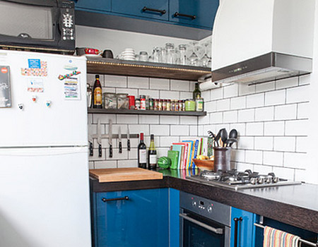 Στις μικρές και ελάχιστα φωτεινές κουζίνες μπορείτε να δώσετε έμφαση στο χρώμα, επιλέγοντας χρωματιστά και πολύ γυαλιστερά έπιπλα.
