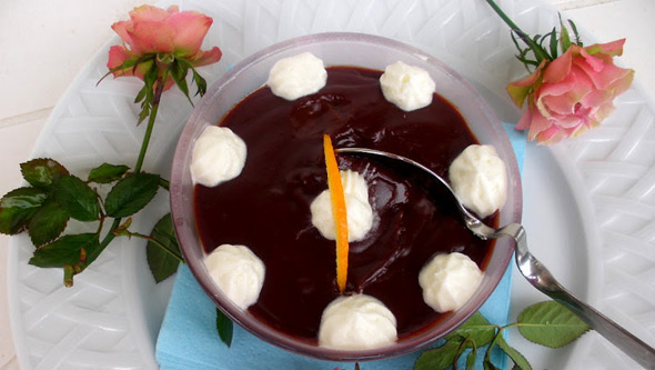 Αφήνετε να ζεσταθεί το νερό και να λιώσουν η κουβερτούρα και η μαργαρίνη σε σιγανή φωτιά, ανακατεύοντας κατά διαστήματα. Σε ένα μπολ, βάζετε το υπόλοιπο νερό, τον καφέ, το κακάο και το κούσταρ πάουντερ και τα διαλύετε, ανακατεύοντάς τα με το σύρμα. Μόλις λιώσουν η σοκολάτα και το βούτυρο και πάρει μια βράση το νερό, προσθέτετε το μείγμα με το κούσταρ πάουντερ και αφήνετε την κρέμα να δέσει (να πήξει) ανακατεύοντάς την συνεχώς για να μην σβολιάσει και "κολλήσει" στην κατσαρόλα. Μόλις η κρέμα είναι έτοιμη, αποσύρετε από τη φωτιά και την αφήνετε να κρυώσει πριν την χρησιμοποιήσετε. Εάν θέλετε να κρυώσει πιο γρήγορα, την βάζετε σε ένα ταψάκι ανοξείδωτο πιο μεγάλο από την κατσαρόλα. Εν τω μεταξύ, χτυπάτε την φυτική κρέμα γάλακτος σε σφιχτή σαντιγύ και κόβετε το κέικ πορτοκαλιού σε κομματάκια.