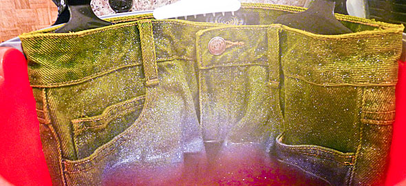 Τέλος, βράστε ξανά νερό, προσθέστε το τρίτο και πιο σκούρο από όλα χρώμα. Βουτήξτε το σορτς, το οποίο έχει στεγνώσει από το προηγούμενο χρώμα, σε ύψος λίγο μετά από αυτό. Αφήστε το πάλι εκεί για μερικά λεπτά και συνεχίστε να το σηκώνετε από τον κουβά σταδιακά για να σχηματίζονται οι σκιές, όπως στη φωτογραφία. Και είναι έτοιμο!