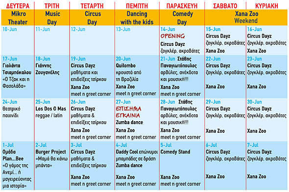 Όσο για τα events που θα λάβουν χώρα εκεί, οι Xana Zoo και οι Burger Project είναι κάποοια μόνο από τα γνωστά ονόματα. Δείτε τα υπόλοιπα αναλυτικά στον παρακάτω πίνακα.