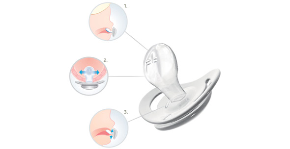 Η βάση της θηλής, ιδιαίτερα μαλακή και εύκαμπτη, επιτρέπει το σωστό κλείσιμο του στόματος, μειώνοντας τις πιθανότητες δημιουργίας κακής σύγκλησης των δοντιών.